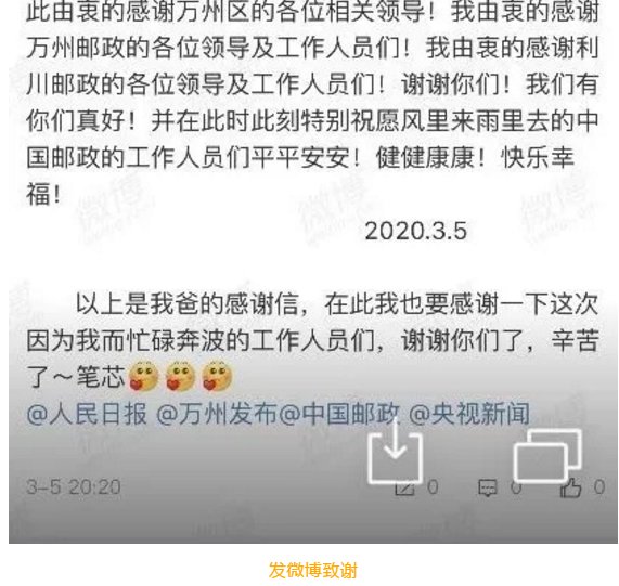 女兒小麗還特意將這封感謝信發了微博,并@了人民日報、央視新聞、中國郵政及萬州發布,向幫助她的人比心。