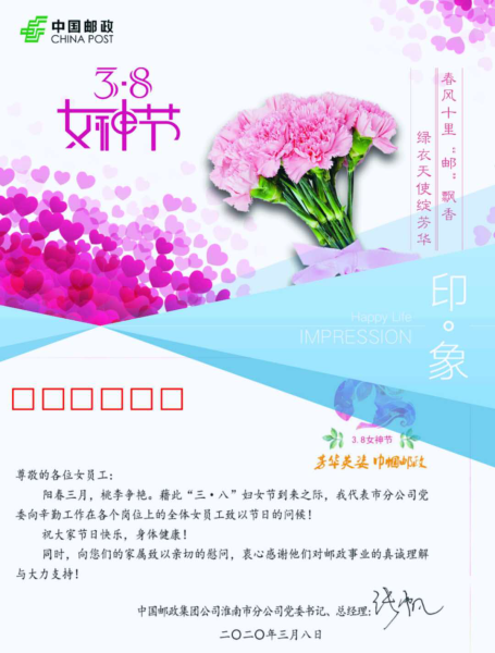 為為體現(xiàn)對郵政女工及家庭的關(guān)心關(guān)懷,表達(dá)對女職工的感激感謝,幫助他們抵御家庭風(fēng)險,鼓勵他們以更加飽滿的精神狀態(tài)投身郵政事業(yè)發(fā)展,構(gòu)建和諧的企業(yè)氛圍,淮南市分公司在2020“三八"來臨之際,細(xì)致入微的為每位“綠衣女神”精心準(zhǔn)備了多種“神秘大禮”,一是為每位女職工及家庭投保了家庭財產(chǎn)和個人意外保險,全力解決員工及家庭“后顧之憂”;二是為每位“女神”購買了75%酒精消毒洗手液,堅決保障疫情期間員工安全健康:三是給每位女神家庭送去有機大米,保障女職工員工家庭生活;四是為“女神”送上傳遞市分公司關(guān)懷的“濃情賀卡”,感謝女職工及家人對郵政事業(yè)的真誠理解與大力支持,鼓舞他們繼續(xù)為郵政發(fā)展注入力量。