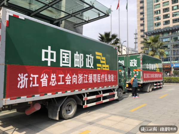 在儀式結束后,裝滿了省總工會價值200余萬元慰問品的4輛郵政專車,立即從浙江省郵政公司大樓出發開往湖北,將盡快發放給醫療隊隊員。(浙江郵政工會)