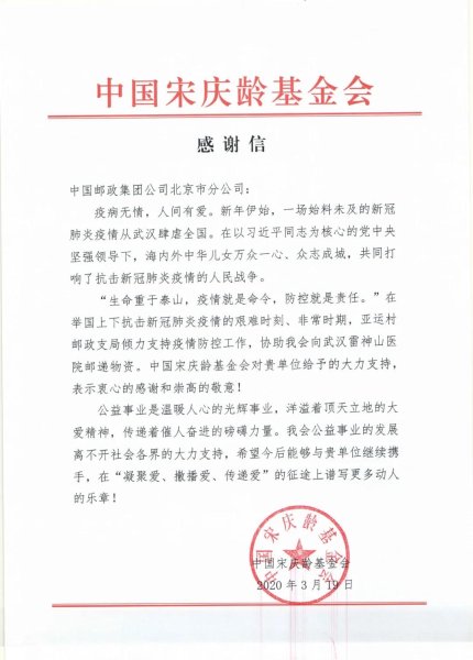 3月19日,中國宋慶齡基金會向北京郵政發來感謝信,對朝陽區亞運村郵政支局在該會向武漢雷神山醫院郵寄物資予以的大力支持表示感謝。