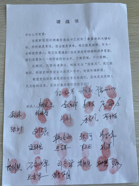 同事的“老師傅”。隨著疫情的嚴峻,投遞郵件的難度不斷加大。為提高投送效率和做好投遞員防控,每天班前會上,柳成玉都要傳達市委、市政府、市郵政分公司的各項工作部署要求,檢查投遞員防護情況,講解防控知識,以及應急方案等。并不停地給兄弟們加油打氣,發紅包鼓勵,傳遞正能量。他主動請纓,帶領33名投遞員在請戰書上簽上自己的名字,按上紅手印,承諾初心不改,招之即戰,將義無反顧地沖在一線,確保完成各項工作任務。
