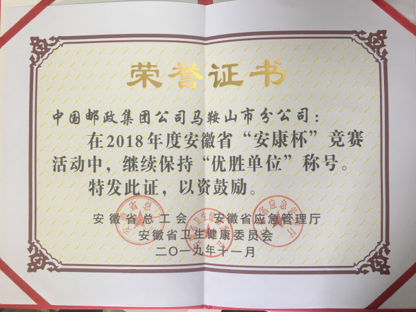 4月20日下午,市總工會召開全市工會十二屆十二次全體(擴大)會議,會上馬鞍山市郵政市分公司受到表彰,榮獲“2018年度安徽省安康杯競賽優勝單位”稱號。 安徽省“安康杯”競賽是在省委、省政府的堅強領導下,按照中華全國總工會和國家安全生產監督管理總局的統一部署,全省企事業單位積極參與,以“廣泛發動提質量,文化引領強基礎”為主題的“安康杯”競賽活動,是安全生產最高榮譽獎牌。