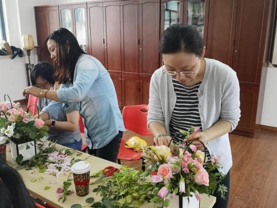 插花是一門技術,一枝一束,一插一剪,都會塑造不同的形態,傳遞不同的情感。活動現場,花藝老師詳細介紹了插花藝術的基本知識、常見花種、插花的基本花型及技巧等內容,給大家普及了理論知識。大家表現出了濃厚的興趣,都禁不住拿起花材躍躍欲試。