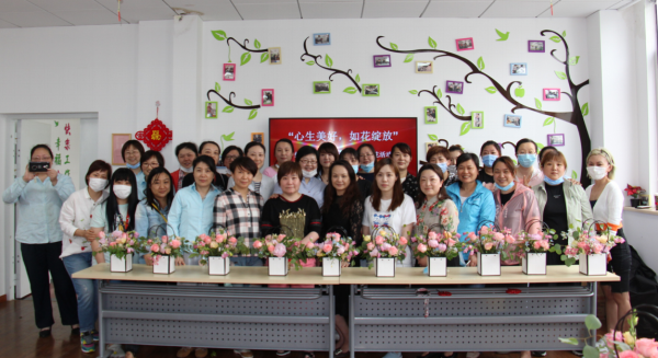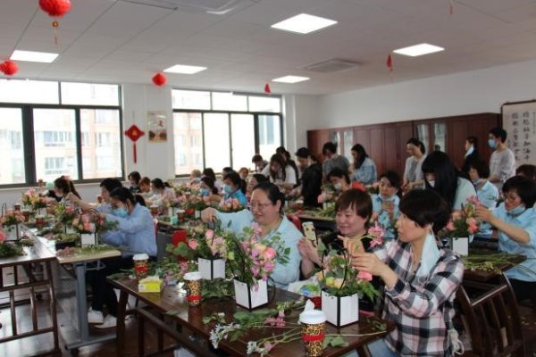 跟隨著花藝老師的示范講解,大家邊看邊學,先從每枝花材的去葉、摘腐處理開始,慢慢修枝剪葉,整理樣式,并逐步按照老師傳授的色彩過渡、高低錯落、疏密有致的插花要領構思插花位置,進行造型搭配。大家個個精工細作,嚴謹認真,用自己的創意與女性獨有的細膩情感,賦予花材全新的生命力。端莊的芍藥、嬌艷的玫瑰、靈動的風鈴、淡雅的桔梗……這些原本簡單的鮮花很快就在一雙雙巧手中綻放出別樣美麗,變成了一件件生機盎然、形態多姿的花藝作品。看著各自的勞動成果,大家笑靨燦爛,臉上洋溢著滿滿的成就感、喜悅感和幸福感。嬌艷的花朵輝映著女職工們燦爛的芳容,撲鼻的花香襯托出女職工們優雅的氣質。 大家紛紛拿出手機,記錄下這詩情“花”意的美好。