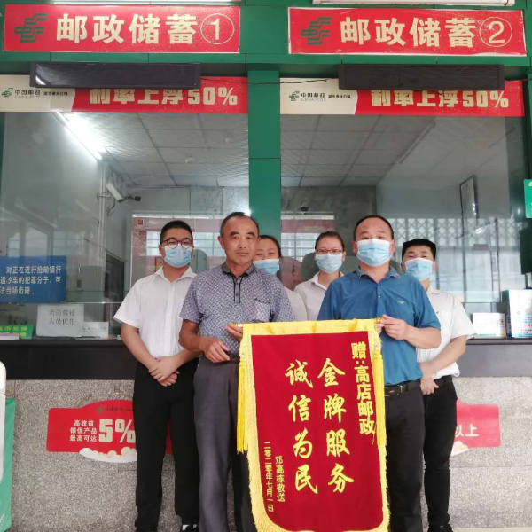 7月6日下午,高店郵政支局收到客戶鄧高棟送來的一面“金牌服務,誠信為民”的錦旗;與此同時,大悟縣分公司綜合辦公室,也收到了鄧高棟女兒送來的一份熱情洋溢的“感謝信”,一致感謝高店郵政支局工作人員提醒,并幫助客戶找回一筆被“遺忘”的存款。