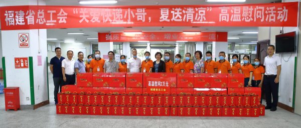 時下已進入一年中最熱的三伏天。 7月17日下午,省總工會副主席張彩珍、基層工作部部長鄧銀行、福州市總工會副主席王慷等一行在省郵政分公司副總經理、工會主席王全江,副主席張勇的陪同下來到福州市郵政分公司斗門投遞營業部,向奮戰在高溫一線的快遞小哥送去了防暑降溫物品,傳遞了省、市總工會對快遞小哥的親切慰問和關懷。