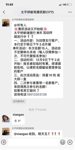 據了解,參與“便民服務商圈”金融客戶惠民體驗活動(以下簡稱活動)的百姓,能以低于市場均價的方式購買到“郵商聯盟”商戶(支行長期合作果蔬商)提供的時令果蔬,果蔬種類逢周更新,涉及西紅柿、香菇、油菜、大蒜、老玉米、扁豆等二十多種常見生活必需品。 活動前夕,客戶可通過支行客戶微信群發起的活動邀約信息,集中進行線上接龍式報名;“接龍報名”一方面便于支行工作人員高效采集活動參與人員信息,另一方面也是提高群成員互動、營造良好群營銷氛圍的好方法。活動規定每名金融客戶常規僅可參與一次優惠,若老客戶邀請新客戶入群,可二次參加優惠活動。在活動現場,支行理財經理穿插為客戶講解了資產配置、新版人民幣真偽鑒別技巧等內容,并宣講了2021年代理金融“開門紅”即將推出的金融產品。