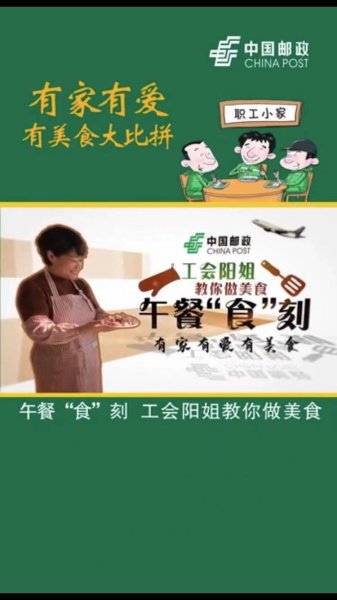為進一步落實市分公司“有家有愛有美食”大比拼活動,將美食文化傳播,讓小家午餐文化更為豐富,12月15日由朝陽郵政工會出品的《午餐食刻——工會陽姐教你做美食》系列視頻第一期正式上線,由朝陽郵政工會同志全員參演制作。
