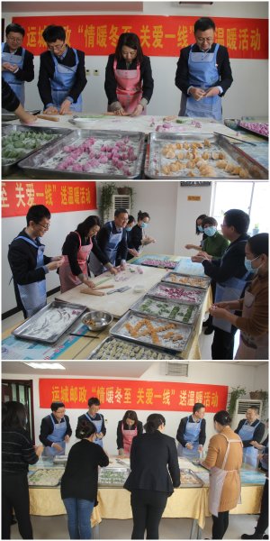 為支撐服務一線經(jīng)營發(fā)展,關心關愛員工,增強企業(yè)凝聚力,讓基層一線員工在冬至來臨之際吃上熱乎乎的手工餃子,運城市分公司工會在全市組織開展了“情暖冬至 關愛一線”送溫暖活動。12月21日一大早,市分公司黨委書記、總經(jīng)理王曉軍、紀委書記范志平、副總經(jīng)理徐志升、副總經(jīng)理郭丙、副總經(jīng)理、工會主席李挺宇與機關職能部門、經(jīng)營支撐部門20余人在機關食堂為一線員工親手包制冬至餃子,和面的、搟皮的、包餃子的,個個忙得不亦樂乎,原本樣式單一的餃子在大家的手中捏成漂亮的形狀,擺成了彩色各異的“冬至快樂”等造型,大家動作嫻熟,配合默契,不一會兒,一盤盤大小勻稱、緊實飽滿、形狀美觀的彩色餃子整齊地擺上臺面,隨后熱騰騰的餃子送至一線,帶來了市分公司黨委及工會對員工的關愛,讓員工們在寒冷冬日感受到“家”的溫暖和幸福。各網(wǎng)點在員工吃上熱騰騰的餃子同時也為客戶遞上了一碗愛心餃子,讓客戶感受到來自郵政的關愛。