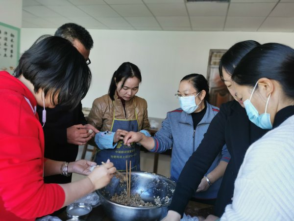 8時30分,參加活動的人到達食堂,大家挽袖洗手,自覺加入準備工作中:摘菜、剝蒜、剁姜、洗蔥、切菜,廚房交響曲頓時響起來了。和餡和蘸料制作是餃味的關鍵環節,素有“小廚師”之稱的鄧玉春自告奮勇,一氣呵成韭菜、芹菜、香菇三種拌餡。大家三、五一組,迫不及待的拿出自己的絕活:楊海清的月牙餃、蘇婷婷的柳葉餃、小馬的擠餃子、殷小娟的三角餃、查曉芝的元寶餃……溫馨的畫面、濃濃的節日氛圍,家的味道洋溢在食堂中。兩個小時后,形態迥異的1400個餃子有序擺放在餐盤中,象等候號角的出征戰士。“三開三點水”后,胖乎乎的水餃,晶瑩剔透的蒸餃、焦黃脆香的鍋貼新鮮出爐,象磁鐵一樣吸引著就餐職工的目光。打好的迫不及待配上小馬秘制的回族蘸料,一面找位一面吃,鮮香酸辣,唇齒留香,味覺和果腹的雙重滿足,讓大家眉開眼笑連聲說“好吃好吃”!