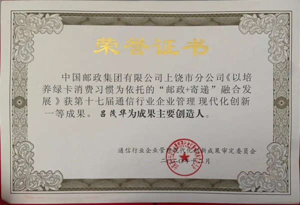 呂茂華,自主政上饒市郵政分公司以來,始終以黨建為統領,以創新為驅動,堅持立標對標,深化機制突破,持續探索經營發展的新思路、新機制,不斷尋求高質量發展的新方法、新方向。在發展上,他順應發展新形勢,在新零售業態下,搶抓先機,構建新零售生態圈,推動農村電商迭代升級,開展寄遞銷售化轉型和能力建設,協同“金融+寄遞+農村電商+便民服務”,滿足新時期客戶的高效、快捷、個性化等需求,推動企業轉型升級。在管理上,他積極倡導“以奮斗者為本”,推進分等分級、同工同酬、獎金池分配機制,開展大學生員工掛職到基層掛職所長,新進大學生“一對一”導師制,專業領域能人任項目組組長,建立專業領軍人才隊伍,激發員工的積極性、主動性和創造性。在他的帶領下,上饒郵政朝著“打造成為江西郵政創新轉型的先行先試區、品質發展的典型示范區、幸福美好的和諧新家園”的目標昂首奮進,企業收入規模和利潤穩居全省前列,各項重點業務指標在全省名列前茅,國際業務進入全國50個重點城市行列。企業先后獲得“全省郵政高質量杯優勝單位”、“江西省文明單位”、“上饒市優秀企業”等榮譽稱號。他主創的《以培養綠卡消費習慣為依托的“郵政+寄遞”融合發展》榮獲了全國郵政第十六屆企業管理現代化創新一等成果和通信行業第十七屆企業管理現代化創新一等成果,是全省郵政唯一一個獲此殊榮的市級郵政企業。