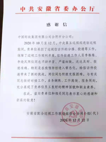 中央第五巡視組進(jìn)駐安徽的兩個(gè)月期間,李維維、李曉鳳兩位同志,因表現(xiàn)突出、作風(fēng)扎實(shí),得到了省委辦公廳的高度評價(jià)!省委總值班室專門發(fā)來感謝信,稱贊他們以實(shí)際行動踐行了“人民郵政為人民”的初心使命!詮釋了“傳郵萬里、國脈所系”的責(zé)任擔(dān)當(dāng)!展現(xiàn)了合肥郵政、安徽郵政的“國家隊(duì)”的精神風(fēng)貌! 市分公司李中勝總經(jīng)理專門指示,號召全體員工向李維維、李曉鳳兩位同志學(xué)習(xí)!以嶄新的形象、全新的面貌,不忘初心使命、強(qiáng)化責(zé)任擔(dān)當(dāng),在追尋首位度的發(fā)展道路上再創(chuàng)佳績!再立新功!