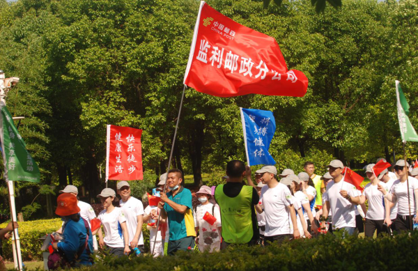 5月9日上午7時,太陽剛剛升起,全體健步走隊友按照規定的時間和地點,準時在機關院內集合,一支98人的郵政健步走團隊分成四組,每組領隊高高舉起“健康生活 快樂徒步”、“強身健體 拼搏奮進”、“人民郵政為人民 ”、“我運動 我快樂”的標旗,穿著統一的運動服閃亮登場,引來過往市民贊揚。