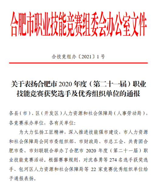 近日,從合肥市職業技能競賽組委會辦公室獲悉,合肥郵區中心局蟬聯合肥市 2020年度(第二十一屆)職業技能競賽優秀組織單位。孔志銘等6名同志榮獲“合肥市技術能手”榮譽稱號。該局連續十二年承辦合肥市業務技能競賽,連續十二年被評為優秀組織單位,涌現一批集團、省級業務技術能手及上百名市級術能手和金牌職工。