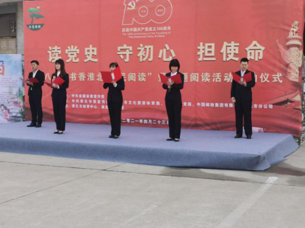 “423世界讀書日”到來之際,淮北市分公司工會積極開展讀書活動,并抽調5人參加淮北市“讀黨史 守初心 擔使命”——第八屆“書香淮北 全民閱讀”暨主題閱讀活動。 4月23日上午9時,主題活動在市體育場如期舉行。此次主題活動由安徽省委宣傳部主辦,淮北市委宣傳部、市文旅體局、市教育局、淮北市郵政公司聯合承辦,市體育中心、市圖書館協辦。 淮北市委宣傳部副部長吳鴻雁講話并宣布活動正式啟動,新時代鄉村閱讀榜樣梁紅宣讀全民閱讀倡議書。