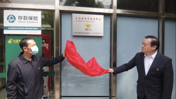 掛牌儀式上,西區(qū)郵政管理局副局長陳亞東和西城區(qū)分公司副總經(jīng)理李和共同為北京郵政第一塊“關(guān)愛快遞員暖蜂驛站”名牌揭幕。郵政、順豐、京東、韻達、申通等部分快遞從業(yè)青年代表參加了活動。