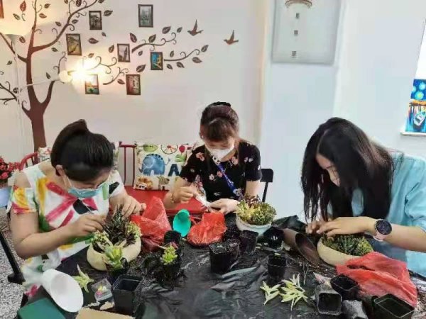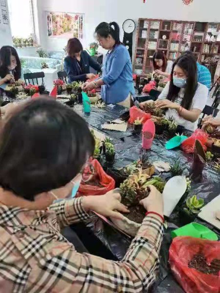 活動伊始,老師通過互動的方式,講解了多肉植物的歷史,喜好的環境、栽培和繁殖方法等,包括澆水、日照、病蟲害防止等生活中常見的問題,在DIY環節,大家躍躍欲試,紛紛手持小工具饒有趣味地種植起來,一邊歡聲笑語,一邊請教老師意見,一會兒功夫,填土、配色、種植……一盆一盆有模有樣的多肉盆栽完工。