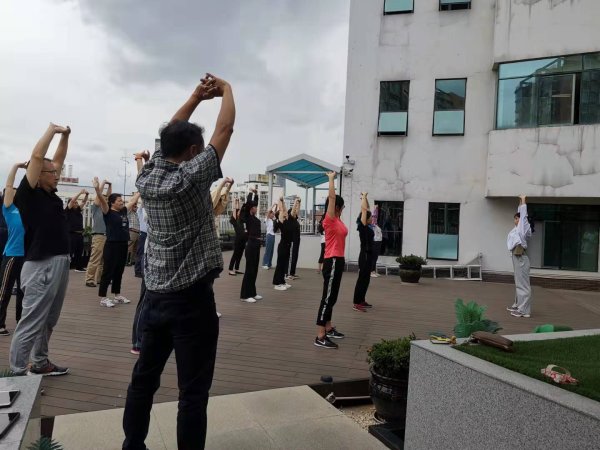 在社會快速發展,各種壓力日益加大的現實情況下,關心職工身心狀態不斷提高職工健康管理意識和健康水平顯得越發重要。學習簡便易行、不受環境、場地限制的一些科學健身方法,能有效幫助職工增強參與運動的興趣和信心,從中獲得持續運動的健康收效。在職工的熱心幫助和推薦下,機關工會組織開展了職工健身八段錦的練習,練習活動安排在下午下班后,大家結束一天忙碌的工作,相約來到四樓平臺,在傍晚的微風中,跟隨老師舒張肢體放松身心,在練習中體會著傳統健身方式帶給自己身體的調適,一天緊張工作的疲憊感,在肢體的拉伸中漸漸被消散。