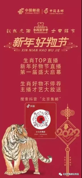 生肖文化連接著傳統民族文化與當代品質生活,為了讓更多人享受到中國郵政生肖文化盛宴,在此歲末年初生肖更替之際,中國郵政開啟2021首屆“中國郵政·文化季” 暨《壬寅年》中國集郵生肖賀歲季。北京郵政在此次生肖賀歲季中主推線上、線下“新年好物節”活動,線上通過“北京集郵”抖音號等公眾平臺,進行連續直播推薦好物;線下在全市多個郵政支局、支行、主題郵局和生肖原地郵局開展“新年好物節”主題回饋活動。