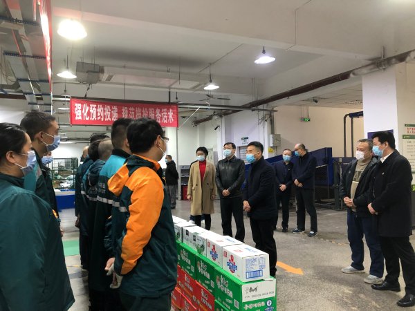 11月10日上午,市郵政管理局周向東局長、市分公司胡紹波副總經理及重慶市快遞業協會代表一行赴沙坪壩區曬光坪營業部慰問奮戰在“雙11”旺季生產一線的投遞員。在作業現場,周向東細致檢查皮帶機等自動化作業設備的安全性,詳細詢問“雙11”期間營業部每日的進出口量,親切關心投遞員的工作及生活情況并送上牛奶、飲用水、方便食品等慰問品。和投遞員們站在一起,周向東稱贊郵政投遞員在關鍵時刻堅守崗位、辛勤工作,體現了郵政企業行業國家隊的責任與擔當,突出了郵政業戰略性、基礎性和先導性的重要作用。最后,周向東親切囑咐大家要在工作中做好防疫防寒。