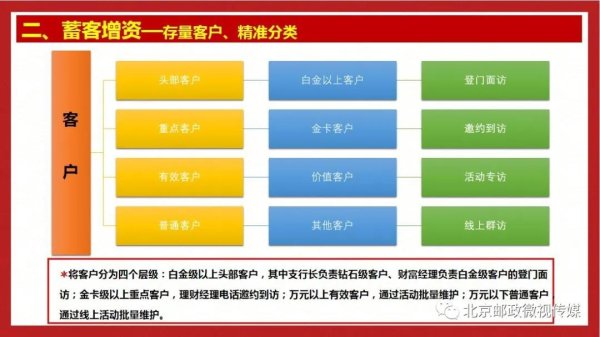 向內(nèi)營(yíng)銷 存量客戶分類營(yíng)銷: 根據(jù)網(wǎng)點(diǎn)客戶資產(chǎn),將客戶分為4個(gè)層級(jí)開(kāi)發(fā)維護(hù):支行長(zhǎng)負(fù)責(zé)鉆石級(jí)客戶、財(cái)富經(jīng)理負(fù)責(zé)白金級(jí)客戶的登門(mén)面訪;金卡級(jí)以上重點(diǎn)客戶由理財(cái)經(jīng)理電話邀約到訪;萬(wàn)元以上有效客戶通過(guò)客戶活動(dòng)進(jìn)行批量專訪維護(hù);萬(wàn)元以下普通客戶通過(guò)線上活動(dòng)進(jìn)行批量群訪維護(hù)。利用CRM系統(tǒng)分析后得知,網(wǎng)點(diǎn)當(dāng)前持有保險(xiǎn)客戶占比48%,仍有市場(chǎng)開(kāi)發(fā)空間,通過(guò)策劃客戶權(quán)益活動(dòng)邀約目標(biāo)客戶到訪,對(duì)其展開(kāi)全資產(chǎn)配置營(yíng)銷。 廳堂客戶立體開(kāi)發(fā):抓好廳堂到訪的“金融、非金融”客戶,做到100%開(kāi)口營(yíng)銷引薦;通過(guò)組織“曬他行存單”活動(dòng),了解客戶整體資產(chǎn)情況,為開(kāi)發(fā)客戶資產(chǎn)做準(zhǔn)備;組織客戶到網(wǎng)點(diǎn)參與香皂制做、包餃子、兒童畫(huà)郵票等活動(dòng),進(jìn)一步提高客戶信任度;日常服務(wù)做到“六個(gè)一”標(biāo)準(zhǔn),即:一聲問(wèn)候、一杯溫水、一段閑聊、一句推薦、一次攙扶相送、一場(chǎng)生日會(huì),將服務(wù)標(biāo)準(zhǔn)納入員工獎(jiǎng)金池行為管控績(jī)效,有效提升服務(wù)質(zhì)量;推介重點(diǎn)產(chǎn)品,提升網(wǎng)點(diǎn)效益與主動(dòng)維護(hù)意識(shí),提升資金滯存率;每月15日至17日養(yǎng)老金期間,開(kāi)展養(yǎng)老客群喜歡的活動(dòng),提升目標(biāo)客戶黏性。 開(kāi)展活動(dòng)促到訪率: 對(duì)CRM系統(tǒng)內(nèi)客戶進(jìn)行精準(zhǔn)篩選,配合各層級(jí)蓄客維護(hù)活動(dòng),按客戶層級(jí)設(shè)置“四重禮”,即:蓄客有禮、進(jìn)資送禮、出單贈(zèng)禮、抽獎(jiǎng)禮;有針對(duì)性、分場(chǎng)次開(kāi)展主題營(yíng)銷活動(dòng),做到活動(dòng)前有準(zhǔn)備、活動(dòng)中有組織、活動(dòng)后有跟進(jìn);通過(guò)開(kāi)展系列維護(hù)活動(dòng),有效激發(fā)客戶的購(gòu)買(mǎi)意愿和參與熱情。
