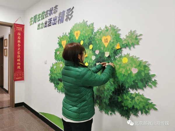職工小家四周特別設(shè)計(jì)了員工“心愿樹”、職工文化墻; 豐臺(tái)區(qū)方莊郵政支局副局長、部門工會(huì)主席王麗萍介紹道:“臨近春節(jié),很多員工都在‘心愿樹’上寫下了新年愿望,你們看現(xiàn)在這棵樹越來越‘枝繁葉茂’了!同時(shí),我們把員工日常開發(fā)的業(yè)務(wù)產(chǎn)品、職工藝術(shù)作品添加到了職工文化墻上,將大家的智慧成果集中展示在小家這塊新天地里,也是我們這次建家的特別用意。”