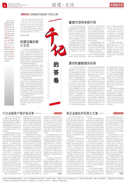 1月19日,《中國郵政報》以《千億的答卷》為題,對河南省分公司金融業(yè)務(wù)勞動競賽發(fā)展取得的優(yōu)異成績進行了整版報道。