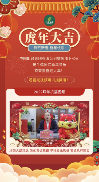 新春佳節(jié)來臨之際,為營造喜慶祥和的新年氛圍,1月30日,蚌埠市郵政分公司開展2022年新春祝福團拜活動,工會會員以掃碼方式觀看,在新春祝福團拜視頻中,市分公司全體黨組成員線上為廣大職工送上新春祝福,同時,穿插了五輪抽獎,驚喜“郵”禮幸運派送,給廣大職工送上虎年大禮。