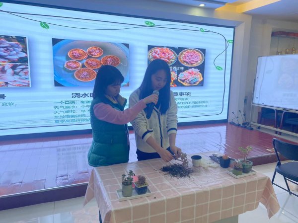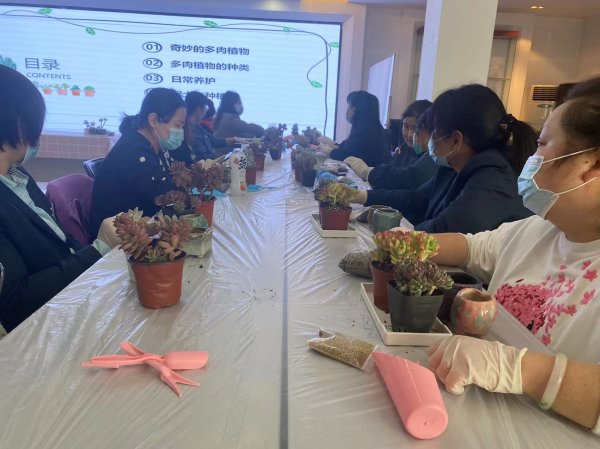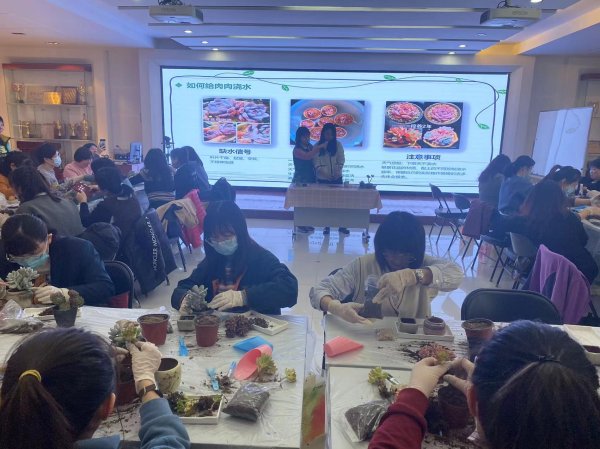 在為期一個多小時的時間里,授課老師對多肉種植和養護進行了全方位的講解和展示,讓在場女職工學會欣賞多肉,通過圖片不僅認識多肉,更從多肉的名稱引申至詩歌,如介紹玉露時,職工會了解到“金風玉露一相逢,便勝卻人間無數”,不僅讓我們的女職工欣賞美,更能受到古典詩詞的熏陶,增強文化底蘊。之后進行了多肉的種植,淡雪、烏木、綠龜卵、桃美人、火狐貍、福娘,多種款式的多肉植物讓大家直觀的接觸并種植。