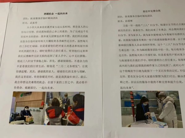 又值一年一度的“三八”婦女節,每逢婦女節的點點滴滴依然歷歷在目。新春佳節,我們迎來了冬奧會,兩會期間我們迎來婦女節,身為家鄉人,我為家鄉能夠成為冬奧城市而感到無比自豪,而我做為服務冬奧的一份子而感到驕傲和自豪。由于疫情的影響我們服務人員必須閉環管理,這個“三八”婦女節也是我人生難忘的一次。作為郵政服務團隊中的一員,每天收寄各類郵件近百件,雖然每天的工作很忙碌,但是看著用戶把對家人的思念與祝福寄托在我們手中,頓時感到自己責任重大,每每聽到他們高興的與我們反饋我的郵件家人已經收到了,此時心中無比驕傲。這個特殊的節日將為我留下一個無比珍貴的記憶,不僅有小家的支持,更有區分公司大家庭在默默為我們付出,解決我們的無后顧之憂。在以后的服務中我將不斷完善和提升自我,讓我們“一起向未來”。