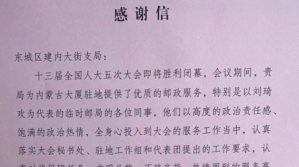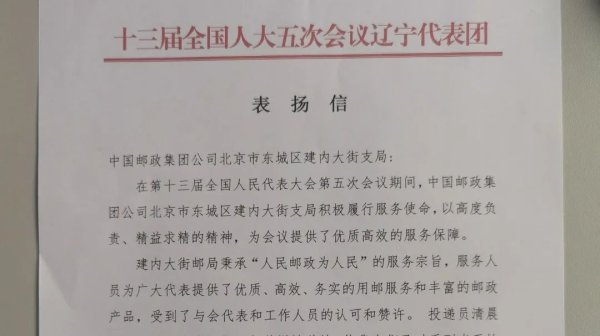自全國兩會召開以來,東城區(qū)分公司的親情服務(wù)舉措受到代表委員的點贊。兩會期間,建內(nèi)大街郵政支局服務(wù)人員除做好郵政服務(wù)外,在得知代表身體不適,忙于會議沒有時間買藥后,主動為代表代購藥品,得到重慶、遼寧代表團感謝。重慶代表團在感謝信中提到“他們以高度的政治責(zé)任感、飽滿的政治熱情,全身心投入到大會的服務(wù)工作當(dāng)中,文明禮貌、不辭辛勞、熱情周到的服務(wù)贏得了駐地代表和工作人員的高度贊揚。” 遼寧代表團在感謝信中提到“建內(nèi)大街局秉承‘人民郵政為人民’的服務(wù)宗旨,為廣大代表提供了優(yōu)質(zhì)、高效、務(wù)實的用郵服務(wù)和豐富的郵政產(chǎn)品,受到了與會代表和工作人員的認(rèn)可和贊許,投遞員清晨就將當(dāng)天的會議用報及郵件送到駐地,保證了時限。在此向中國郵政致以誠摯的感謝,并提出表揚!”