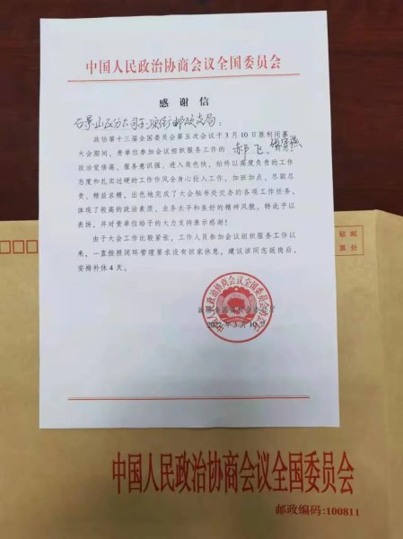 3月10日,政協(xié)全國委員會向石景山區(qū)分公司寄來感謝信,對郵政兩會服務(wù)工作給與充分肯定和衷心感謝。信中表示,石景山區(qū)分公司郝飛、張宇燕同志加班加點,恪盡值守、熱情服務(wù),出色地完成大會秘書處交辦的各項工作任務(wù)提出重點表揚。(北京郵政工會)