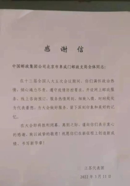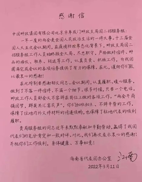 駐地海南代表團(tuán)和江蘇代表團(tuán)分別寫來了感謝信 圖片 十三屆全國(guó)政協(xié)五次會(huì)議總務(wù)組致信市分公司,感謝西四郵局唐兵“工作加班加點(diǎn),盡職盡責(zé),不辭勞苦,政治站位高,大局意識(shí)強(qiáng),展現(xiàn)出昂揚(yáng)飽滿的工作熱情、務(wù)實(shí)高效的工作作風(fēng)和積極作為的工作擔(dān)當(dāng)”。