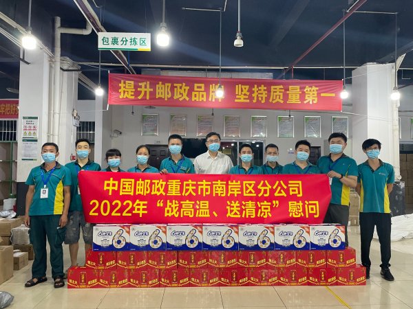 重慶連日高溫來襲,驕陽似火,酷暑難當。考驗著奮戰在一線的郵政員工的同時,也牽動著分公司領導的心。為了做好防暑降溫工作,改善員工的工作條件,確保一線員工做好“疫情防控”的同時平安度過炎炎夏日,促進各崗位安全生產。南岸郵政開展“戰高溫、送清涼”活動。