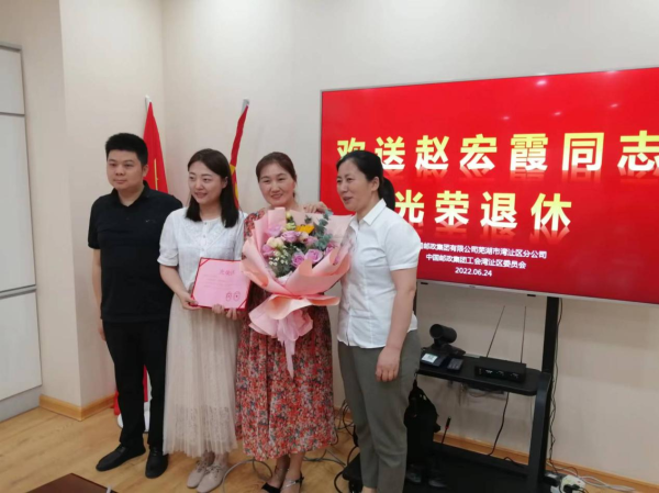 區公司黨支部書記、總經理代表區分公司向光榮退休的趙宏霞同志作歡送詞,歡送詞中充分肯定了趙宏霞同志多年來在工作崗位上勤勤懇懇、任勞任怨、不辭辛勞,對其把最美的青春奉獻給了郵政事業表示衷心的感謝! 副總經理、工會主席代表分公司工會為趙宏霞同志頒發了退休證書,并獻上鮮花,為趙宏霞同志為分公司所做出的貢獻表示感謝。 歡送會上,趙宏霞同志談了自己的退休感言,激動之情溢于言表,表達了她對公司的留念之情、感激之情和對同事們的難舍之意。