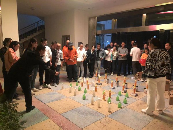 吃飽喝足后,開始了各項趣味游戲。首先是套圈圈游戲,放眼望去,等待的隊伍早已排成一條長龍,周圍聚滿了加油喝彩的觀眾,歡聲笑語此起彼伏,不絕于耳,一個個獎品陸續被套走,大家心里不亦樂乎。
