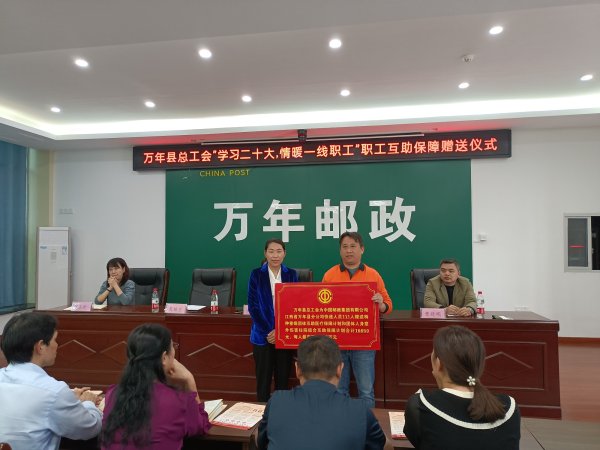 隨后,吳銀蘭、曹曉明分別向萬年郵政職工代表贈送了特種重病團體互助醫療保障計劃和團體人身意外傷害住院綜合互助保障計劃合計16650元,每人最高保障金7萬元。