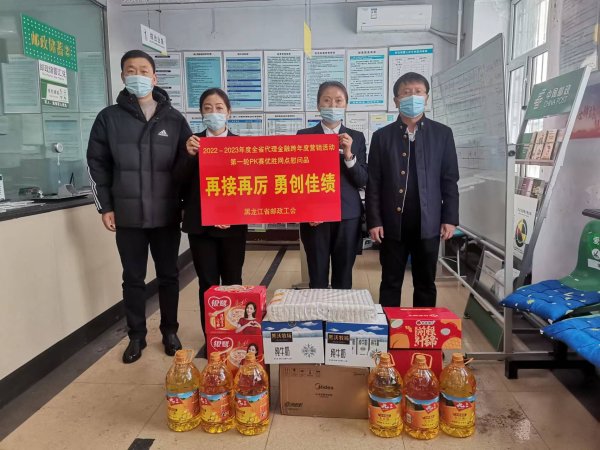 2022年11月16日密山市分公司總經理周華偉和工會主席于雷代表省郵政工會,前往知一郵政支局開展慰問活動,知一郵政支局在《2022-2023年度全省郵政代理金融跨年度營銷活動》第一輪PK賽中獲得優勝網點。郵政工會精心為知一郵政支局準備電飯煲、牛奶、罐頭、八寶粥、豆油等。