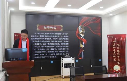 為全面奪取開門紅的勝利,體現海北郵政員工敢打敢拼的精神,提升技能,激發士氣,緊抓跨年度旺季生產,落實青海省分公司旺季營銷活動總體要求,確保12月31前完成跨賽保險收入計劃目標,推動全年代理金融朝更高目標、更優質量發展。11月24日,海北州分公司組織召開2023年度代理金融“開門紅”旺季啟動會,參加此次啟動儀式的有州分公司黨委書記、總經理劉武龍及州分公司領導班子成員;縣分公司領導班子成員、金融業務管理人員、網點支局長、理財經理、機關部室全體人員。