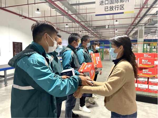 為認真落實安徽省郵政工會關于關愛職工相關工作要求,為一線人員緩解工作壓力,11月8日,國際分公司工會深入一線慰問,為奮戰一線的工作人員送去牛奶、方便面、自熱米飯、火腿腸、創可貼、酒精噴霧、毛巾等慰問品。在現場,工會主席與一線人員親切交談,詳細了解大家在旺季生產中的工作和生活情況,對他們不辭辛苦、默默奉獻的工作態度表示感謝,并叮囑大家在完成工作任務的同時也要結合當前疫情防控形勢充分做好自我防護,時刻關注自身健康和出行安全。