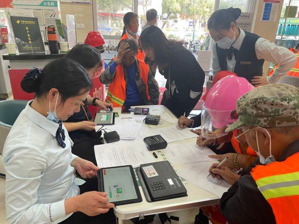 “叔叔,您把身份證拿給我,在這里填寫一下表格,等會兒工作人員會提示您接下來會有什么操作,按照提示進行就可以了”“阿姨,請往這邊坐,把身份證拿出來給我們工作人員操作”。現場,環衛工人人滿為患,紛紛按照營業員的提示拿出證件填寫道路排隊等候辦理新的工資卡。
