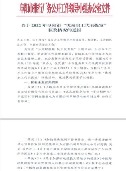 近日,在阜陽市2022年度“聚合力 促發展”全市優秀職工代表提案征集推薦活動中,太和縣、界首縣郵政工會上報的《關于加強郵政攬投人員培訓的提案》及《加強工會小組建設提案》,分別榮獲全市國有企業提案三等獎。