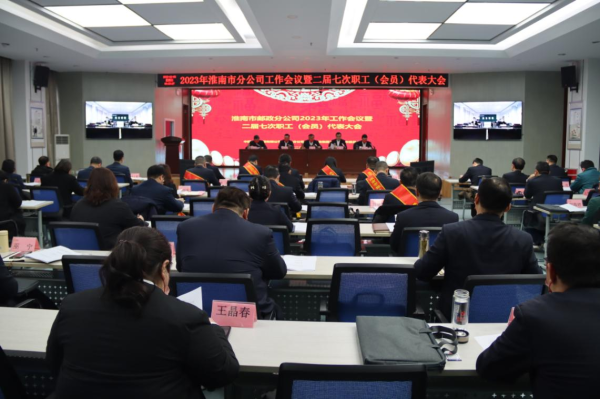 2022年1月26日上午,中國郵政集團有限公司淮南市分公司召開工作會議暨二屆七次職工(會員)代表大會。市分公司領導班子成員、縣分公司主要負責人、全市四級副及以上人員和部分職工代表在主會場參會。各縣分公司領導班子其他成員、各部門主要負責人及縣分公司職工代表在分會場參會。