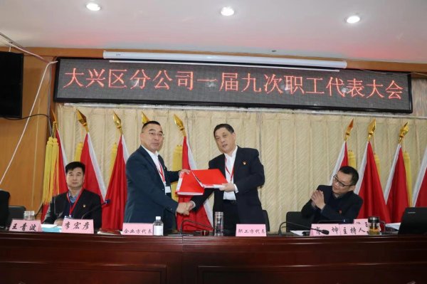 3月3日,大興區分公司隆重召開了第一屆九次職工代表大會。 大會聽取審議了《大興區分公司2022年行政工作報告》,審議并通過了《2022年財務計劃執行情況》、《2022年人工成本、教育經費計劃執行情況的報告》、《2022年黨風廉政建設報告》、《2022年辦實事落實情況和2023年辦實事立項的報告》,會上簽訂了2023年工資集體協商協議。
