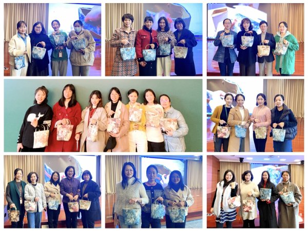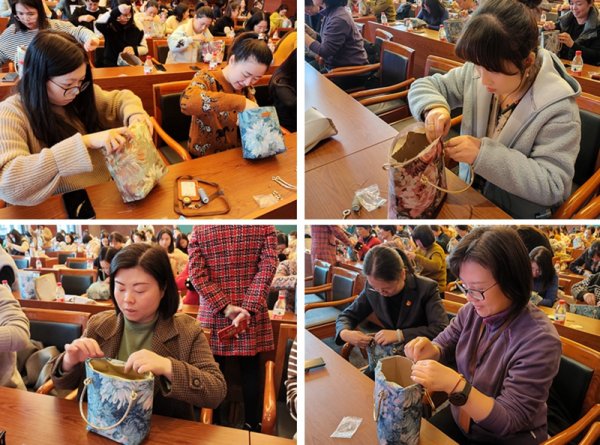 在油畫風托特包制作環節,手工老師講解了制作油畫風托特包的技巧和注意事項,然后老師教女員工們怎么安裝手環、縫制包邊,最后呈現出完美的成品。經過套袋、釘扣、縫邊等一道道工序,約花了一個多小時,一個個精美的油畫風托特包就做好了。女員工對自己的作品也非常滿意,紛紛拍照留念。