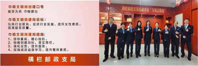 創建籌備需要將近1年的時間,為做好創崗工作,橫欄支局成立“巾幗文明崗”創建活動工作領導小組,支局長帶領團隊明確建崗目標、建章立制、布置廳堂,將創崗工作融入日常工作中,促使全員積極投入,營造出濃厚的創崗氛圍。