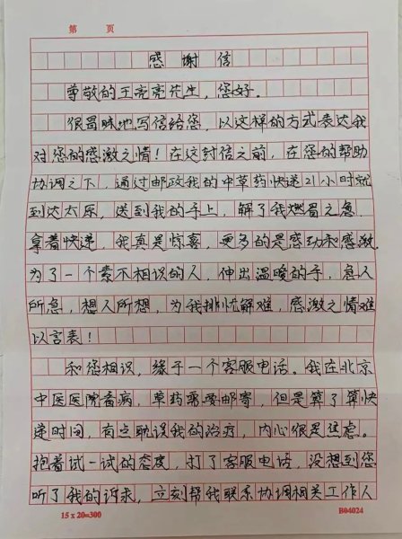 收到郵件,洪女士十分感動與感謝,她寫了一封信郵寄到北京郵政。信中她這樣說: 最讓我感動的是您時刻牽掛著我的快遞,犧牲周末的休息,早上6點第一時間告訴我快遞信息,對于一個身患疾病渴望及早治療的人來說,這份關心是多么及時,多么溫暖,多么珍貴! 我深切地感覺到一名普通郵政員工,不僅敬業專業,更是一個有溫度有愛心的善良之人。通過您,通過郵政客服窗口,讓我重新認識了一個有速度、有效率更有溫度的郵政!