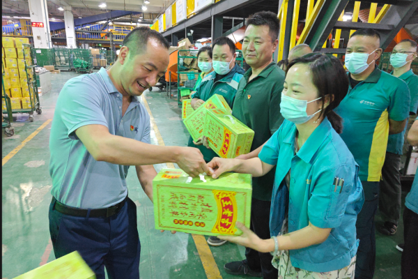 6月2日,昆明郵區中心總經理張進、中心工會副主席郭穎帶領工會人員,來到分揀、轉運等一線作業部門,看望慰問冒著酷暑辛勤工作的職工,為職工送上冰紅茶、酸梅汁、龜苓膏等防暑降溫清涼飲品。