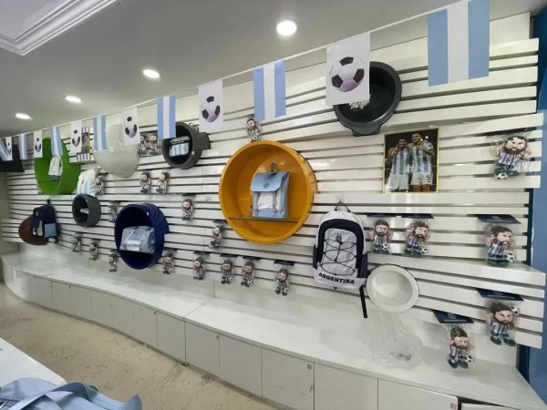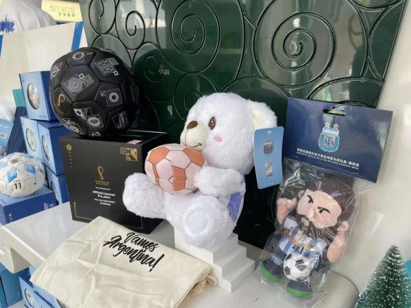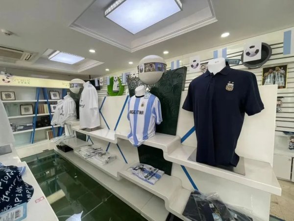走進體育郵局,店內已經掛滿阿根廷隊的彩旗裝飾,阿根廷隊的經典照片也被擺放在柜臺之間,球迷們在此可以購買到印有阿根廷足協標識的助威T恤、阿根廷官方版畫,印有梅西名字和10號的圍巾、帽子及阿根廷藍白配色的杯子、水壺、手辦和毛絨玩具等55款授權商品。