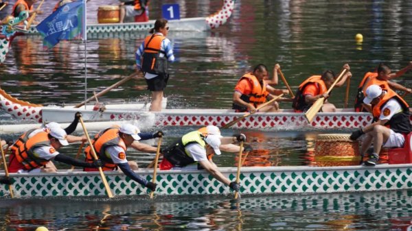 鼓手在前,有節奏地打起鼓點,舵手發力把握方向,槳手們快速有力劃起船槳,龍舟快速向前。